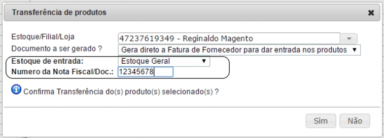 Depois de selecionar o estoque de entrada a fatura é gerada automaticamente.