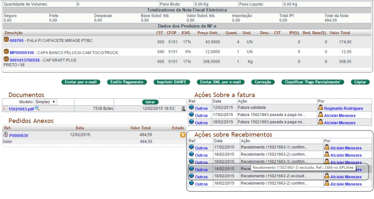Na versão 5.23 do APLWeb, agora está mais detalhado as ações que são aplicadas sobre uma fatura. Anteriormente, eram registrados apenas as ações de validação da fatura, que era registrada ao confirma-la, o cancelamento da fatura e quando a fatura era colocada como paga por total. Agora além de registrar outras ações como criação e modificação da fatura, está detalhando também os recebimentos que são registrados para a fatura, ou seja, para cada pagamento efetuado, será agora registrado, assim como se o pagamento for excluido o mesmo ocorrerá. Para ser demonstrado esta nova informação foi acrescentado logo abaixo das Ações sobre a Fatura que já existia abaixo dos botões e ao lado dos Documentos, para detalhar essas ações de recebimentos registradas.