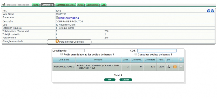 Ao clicar na guia você irá visualizar informações da nota fiscal como o número, o fornecedor, a filial ou loja, o total de itens e de quantidades existentes na nota fiscal, o total de itens e quantidades já conferidas, o que falta conferir em itens e quantidade e a situação da nota fiscal que inicialmente fica como Não foi Conferida. Basta então iniciar a leitura dos códigos de barras para que os produtos sejam mostrados na lista abaixo com informações como a quantidade já conferida, a quantidade pedida se houver algum pedido do produto, a quantidade existente na nota fiscal, o que falta ainda conferir para fechar a conferência do item e o estado de conferência do item que inicialmente fica como Parcialmente Conferido e quanto é fechado (as quantidades da nota batem com as conferidas) fica como Conferido. O APLWeb só irá assumir que a nota fiscal está como totalmente Conferida, quando todas as quantidades de todos os produtos dela forem totalmente conferidos, ou seja, suas quantidades da nota e a conferida estejam iguais.