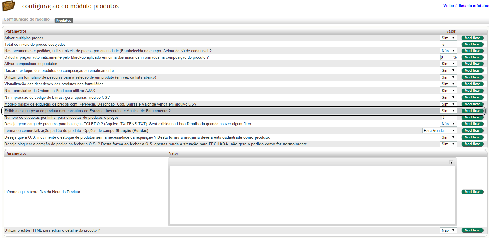 Agora na verão 5.62 mediante o parâmetro, permite exibir uma coluna com a informação total de peso dos produtos. Assim na consulta de Análise de Faturamento totalizado por produtos irá aparecer essa nova coluna. Abaixo mostramos a tela de parâmetros do módulo de Produtos e a consulta totalizada por produto.
