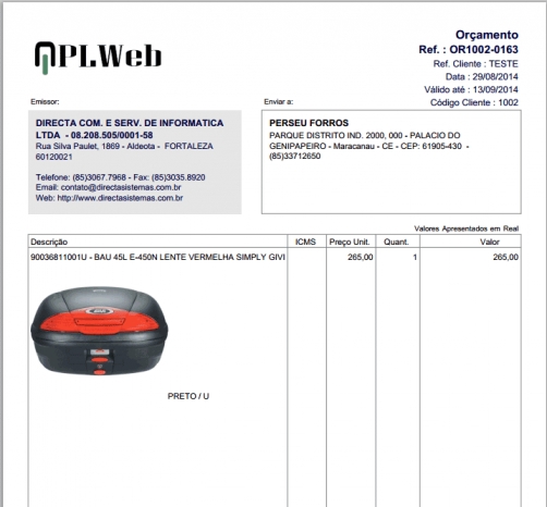 Na versão 4.52 do APLWeb, foi criado um novo modelo de proposta comercial. Ela conta com um campo para exibição da Foto do produto. Além disso a coluna Referência está separada da descrição diferente do modelo padrão. Independente do parâmetro na configuração do modulo de orçamentos mostrado na versão 4.51, o APLWeb irá exibir a foto do produto desde que esteja cadastrada na guia Fotos, do cadastro de produtos.