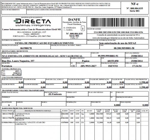 Quando esta opção está como NÃO, o DANFE é gerado e exibido como abaixo. Esta é a opção por padrão no APLWeb. Informa a descrição do produto e o detalhe vai nas informações adicionais do produto, campo disponível no XML a partir da versão 2.0 da NF-e.
