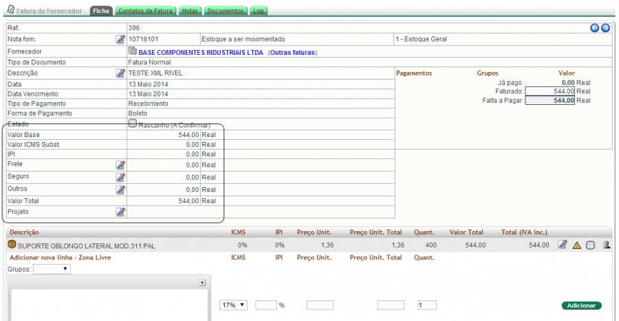 Observe que é adicionado um item de serviço, descrevendo o serviço de frete com o valor do mesmo. Depois de associadas as faturas, é possível através de links que se encontra na ficha de cada uma, alterar entre uma e outra, facilitando a localização tanto da fatura de compra quanto a fatura de transporte, quando as mesmas são separadas, como mostras as imagens anterior e a imagem abaixo.